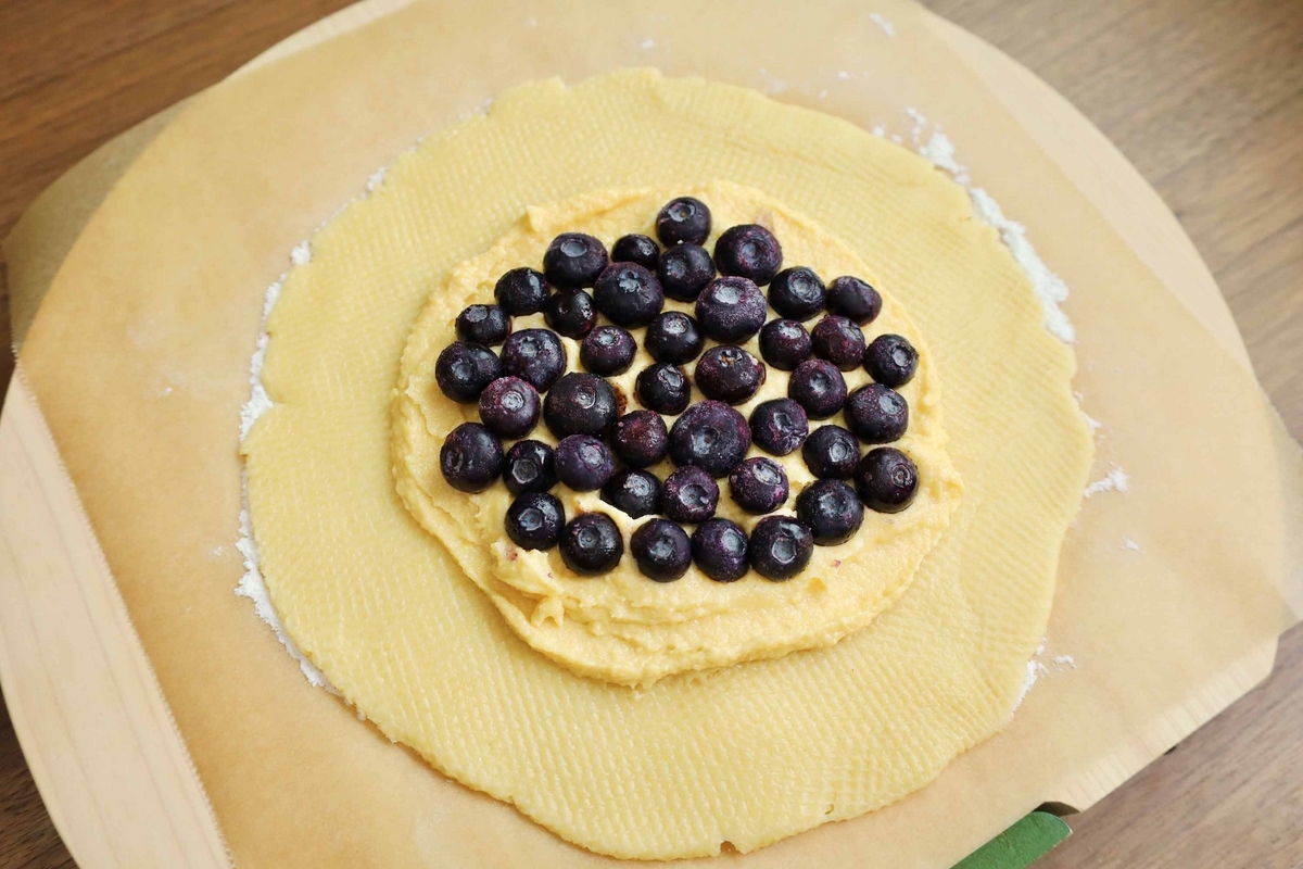 クリームの上に冷凍ブルーベリーを敷き詰めて