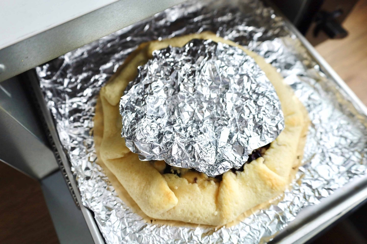 そのタイミングで、クランブルの部分だけアルミホイルで覆ってあげてください。それ以上焦げなくなります◎