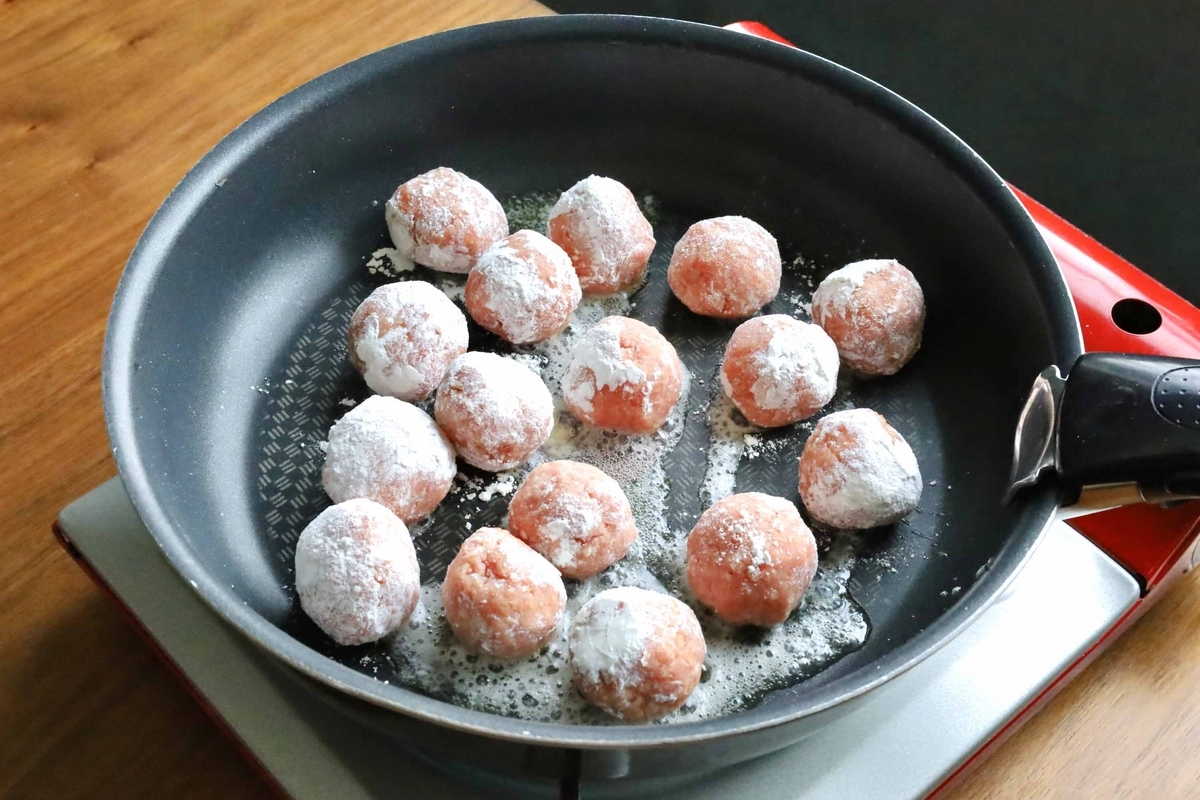表面に薄力粉をまぶします。こうすることで、お肉に薄い膜ができて水分が外へ逃げにくくなり、柔らかジューシーなミートボールに仕上がります