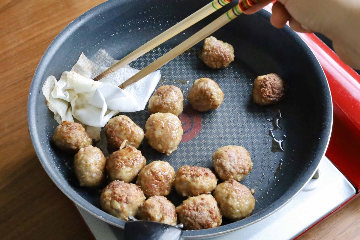 ミートボールをIN!全体に良い焦げ色がつくまで焼いていきます