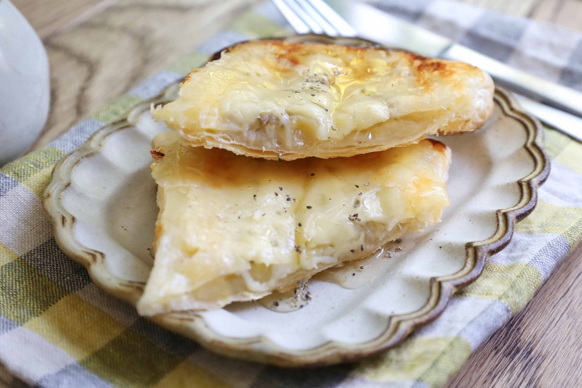 カリッカリに焼けたチーズ×加熱されてとろとろになったバナナ×サックサクなパイ生地!そこに蜂蜜好きなだけ垂らしていただきます。