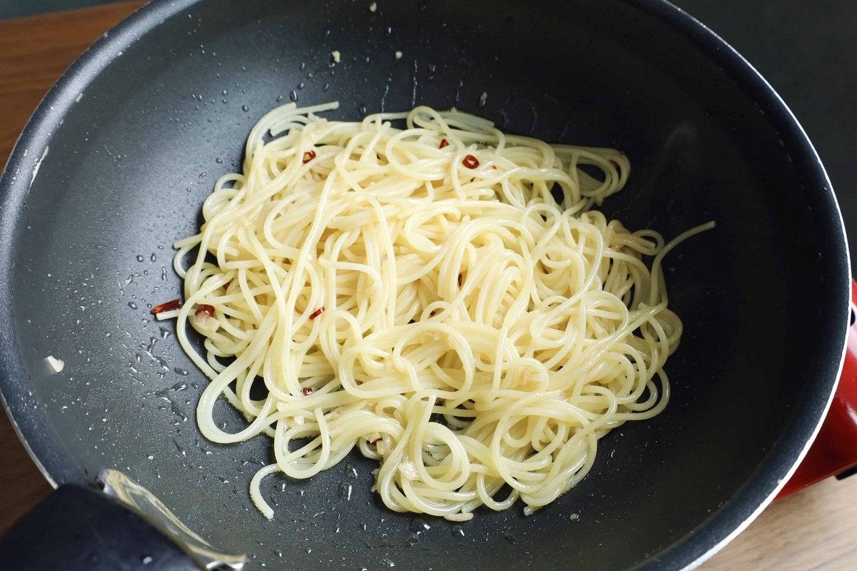 そこに茹で上がったパスタをドーン!にんにくオイルを全体に絡める感じで、手早く混ぜたら…