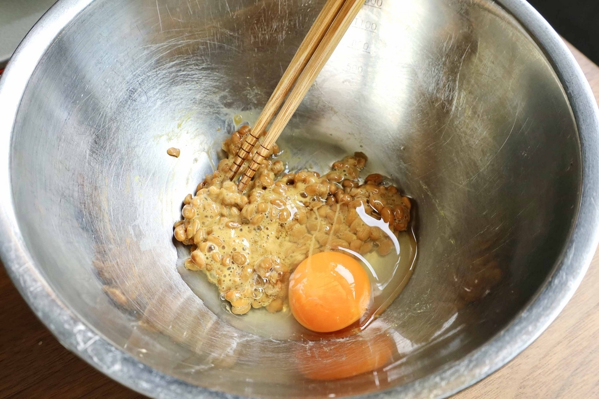 ボウルに納豆1パックを入れたら、付属のたれとからしを加えてかるく混ぜます