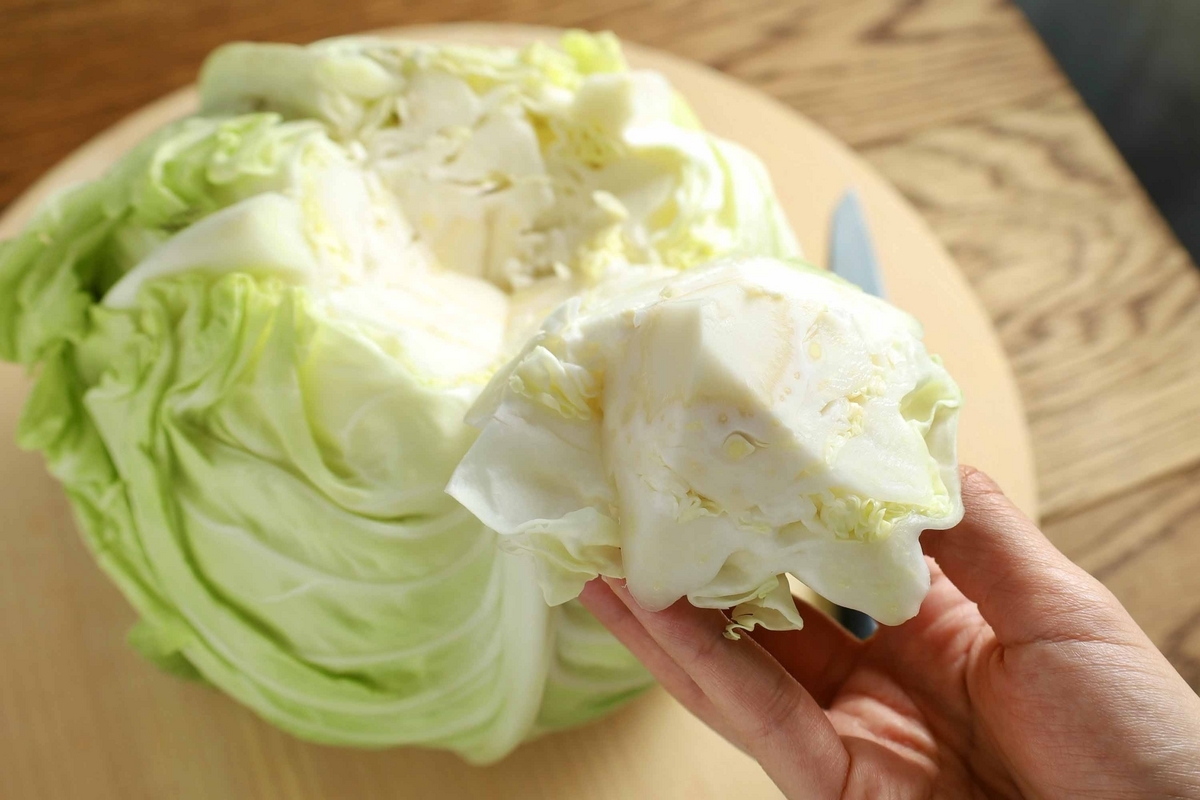 キャベツはひっくり返し、芯の部分に5角形の切り込みを入れて、スポッと芯を抜き取ります。(保存する際は、穴の部分に濡らしたペーパーを詰めてね!)