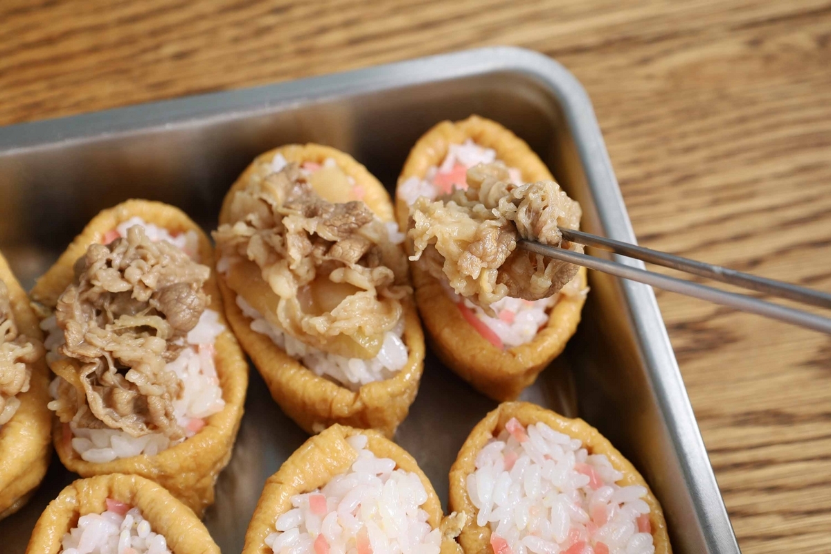 そうそう。自分はお肉を乗せた後、袋に残った「牛丼のつゆ」をスプーンですくって、ご飯に染み込ませています。我が家ではこれを「いなりのつくだく」と呼びます。噛むたびにジュワ~っとお出汁が出てきて最高…