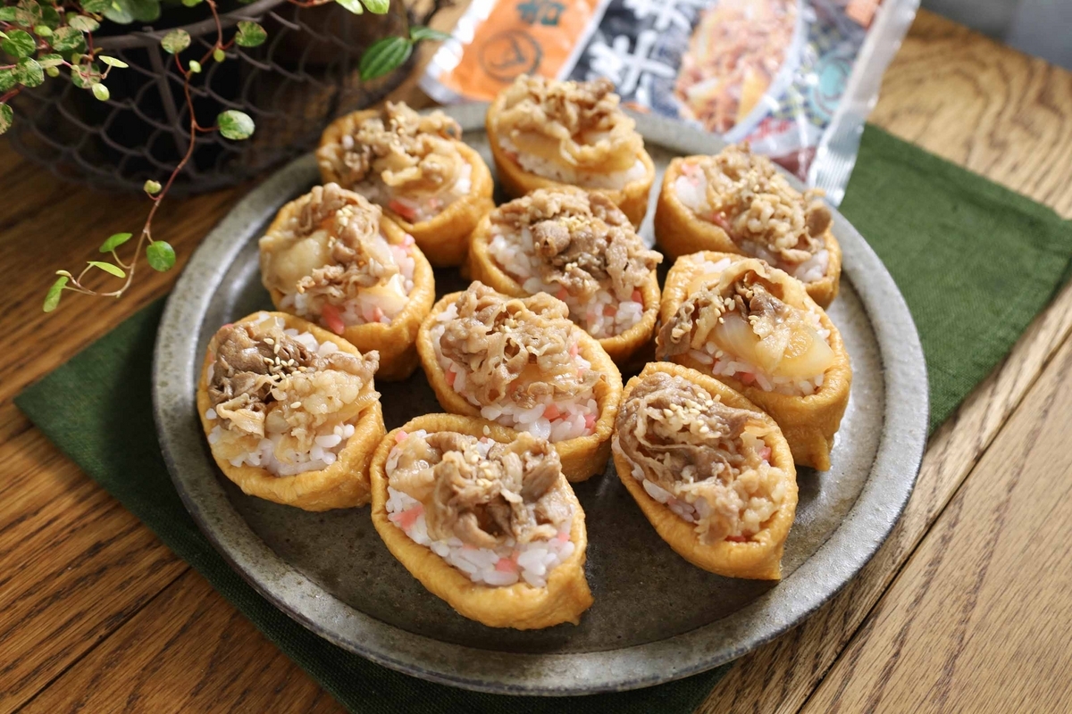 温めた牛丼の具をおいなりさんの上にのせれば…