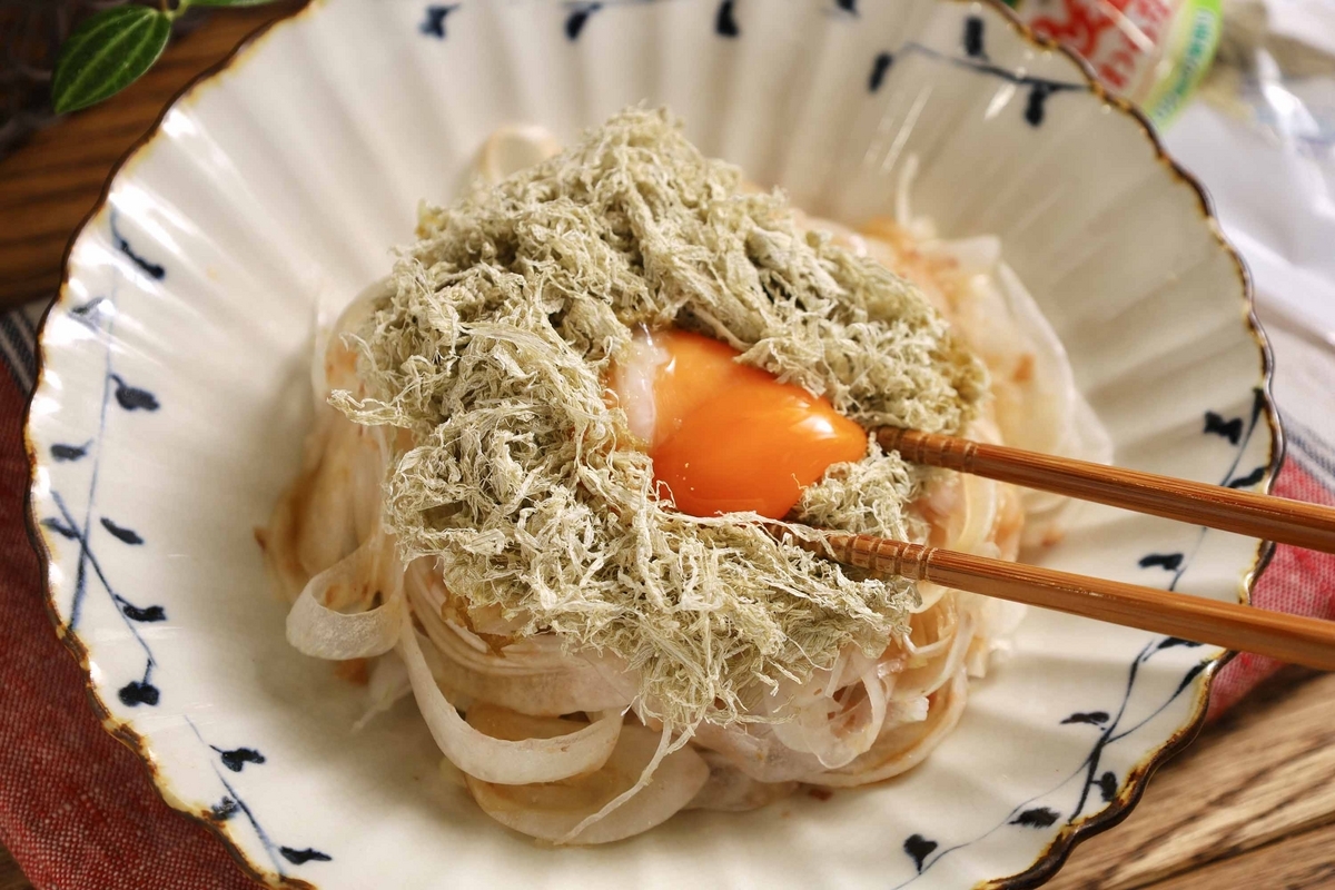 通常のオニオンサラダって、スライスした玉ねぎにかつお節+めんつゆ+卵黄をかけることが多いと思うのですが、ここに是非「とろろ昆布」をプラスしてみてほしい…旨みが爆発します!!