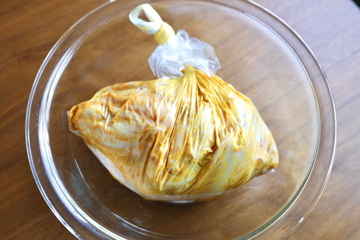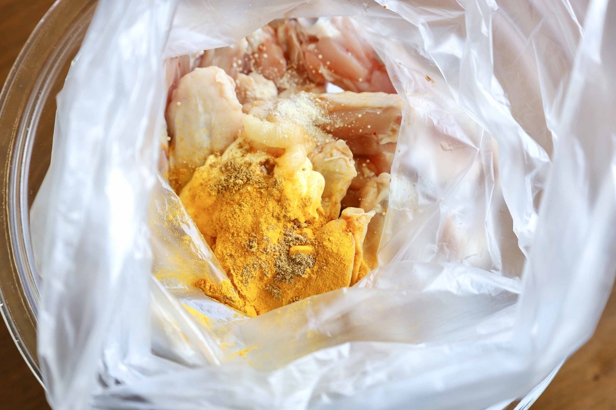 本当はカレー粉を使って味付けをしたいんだけど、辛くなってしまうんですよね😿そこで使用するのが「クミン」と「ターメリック」!この二つのスパイスさえあれば、しっかりカレー色+カレーの風味がする辛くない手羽揚げを作ることができます🙌✨