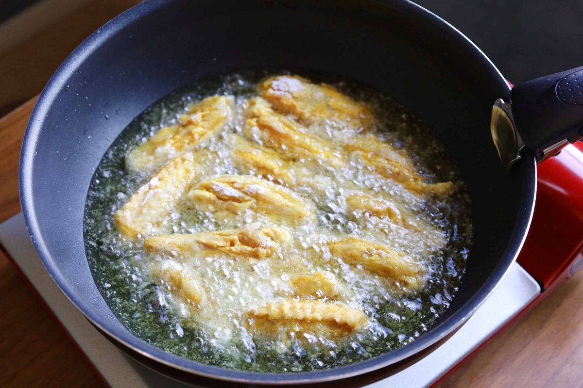 あとはフライパンに少し多めの油を注ぎ、しっかり温めてから手羽中を投入!