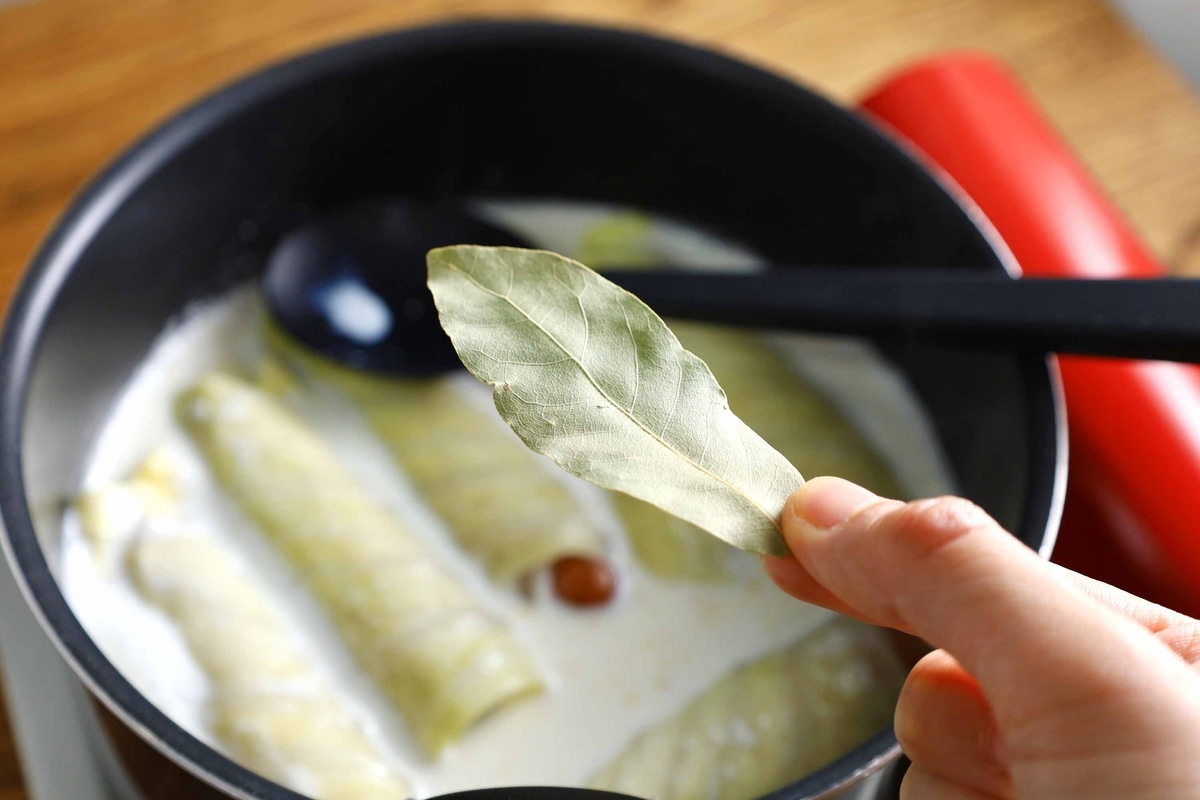 材料には書いていないけれど、もしローリエがあったら加えてみて下さい!風味がとってもよくなります◎(我が家は料理に使うためにローリエを育てています…笑)