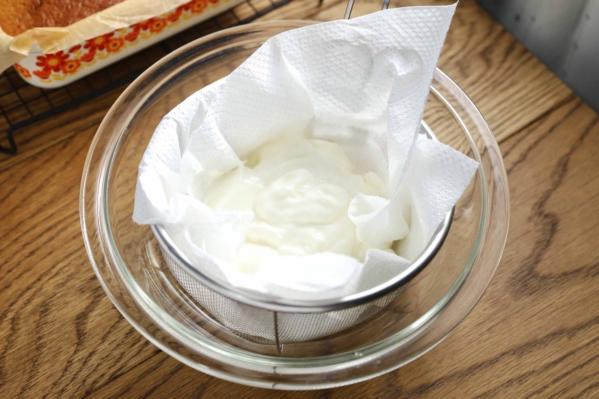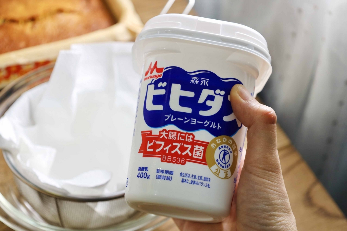 可能なら、一日前に無糖ヨーグルト400gを水切りしておきましょう!翌日、ヨーグルトの重さが200gになっていればOK!