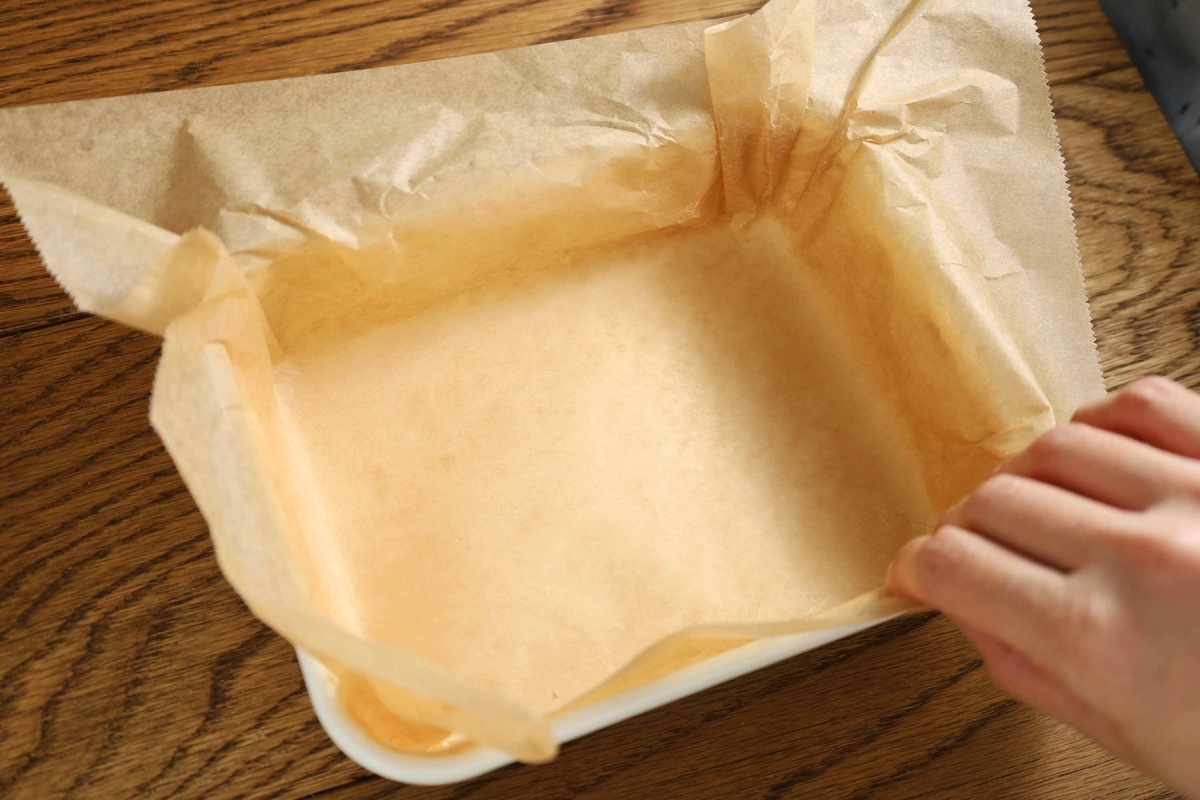 …といっても、クッキングシートをわしゃわしゃ敷き詰めるだけなのですが(笑)ちなみに今回のホーローではまだまだ余裕がある大きさなので、もう一回り小さい容器でも焼けす。(18×12×6など!)