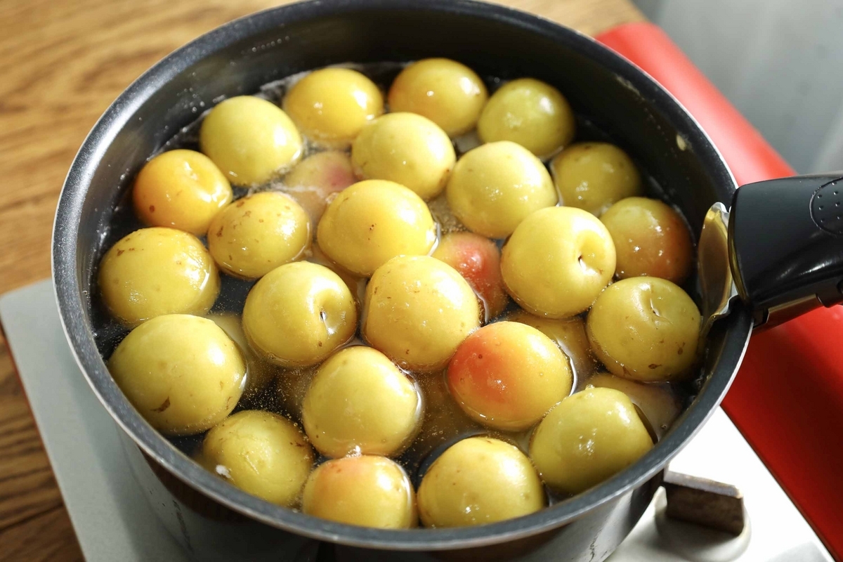 その状態をキープしつつ、15分だけ加熱します。決してぐらぐら沸騰させないように注意してください!(梅の実の皮が破れてしまうため)