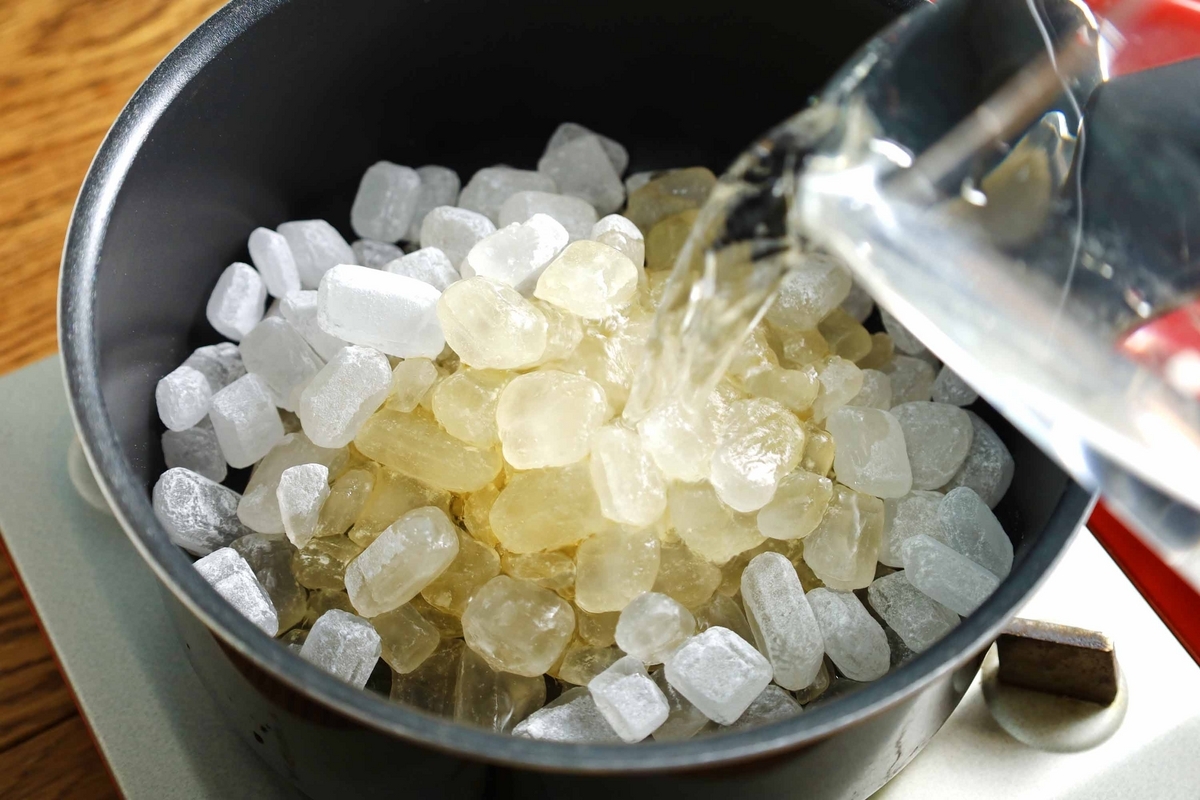 ちなみに写真では氷砂糖を使用していますが、グラニュー糖でもOKです。なんなら氷砂糖はめちゃくちゃ溶けにくいので、あまりお勧めしません!笑(氷砂糖は他の砂糖よりも純度が高く、すっきりとした甘みで素材の風味を引き立てるのに適している…ので、自分は氷砂糖を使っています)