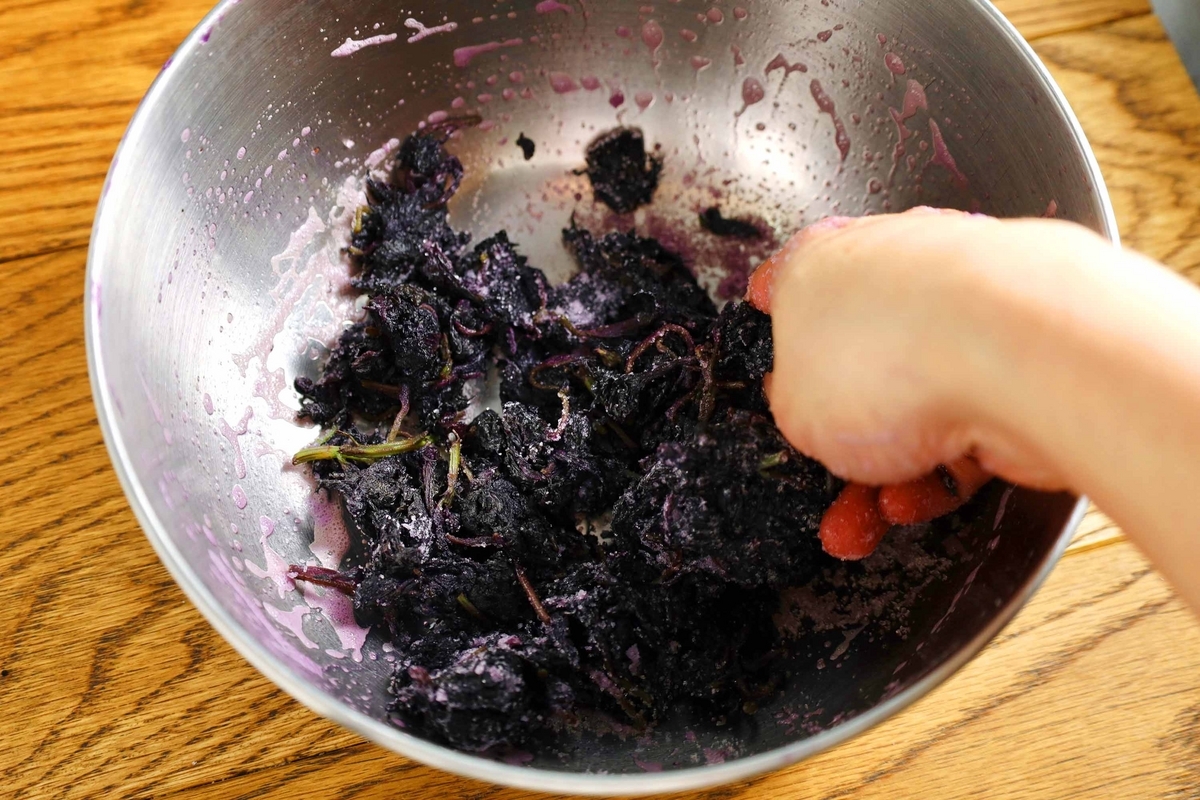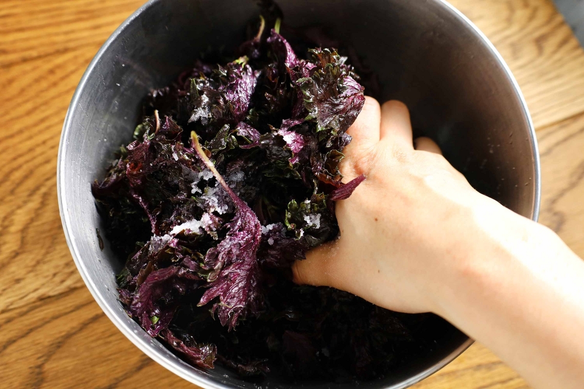 固く絞った赤紫蘇をやさしくほぐすように揉み込んでいきます