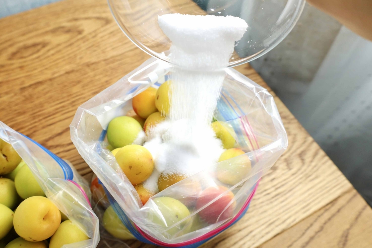 梅全体が梅酢にしっかり浸かるし、使い終わったら袋を捨てたり再利用できるし、場所を取らない!オシャレ度は瓶より劣りますが、本当におすすめです✌✌✌