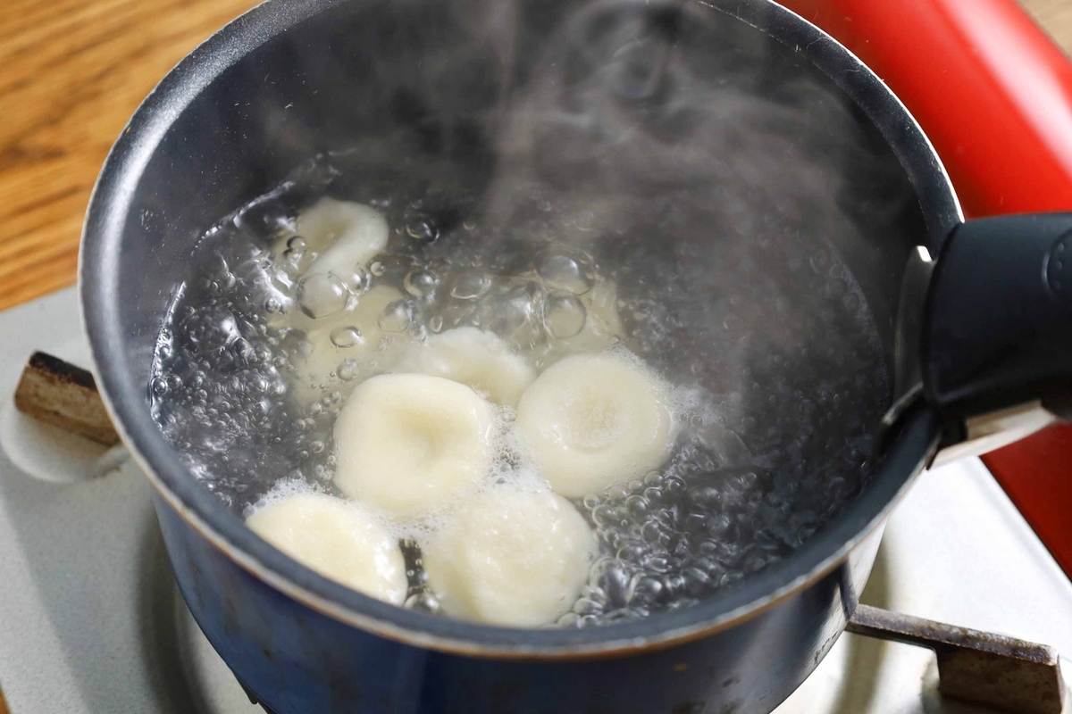 熱湯で茹でましょう!茹で上がりの目安は、白玉が水面に浮いてきてから2分間加熱した状態。こうすることで生煮えを防ぎます。