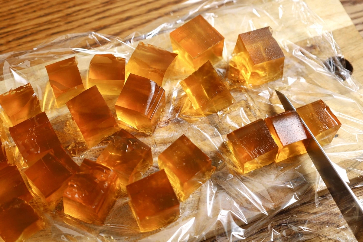 そんなこんなしているうちに、ほうじ茶ゼリーも固まったようです!水で濡らした包丁を使って、ダイス状にカットしましょう(断面が綺麗になる)