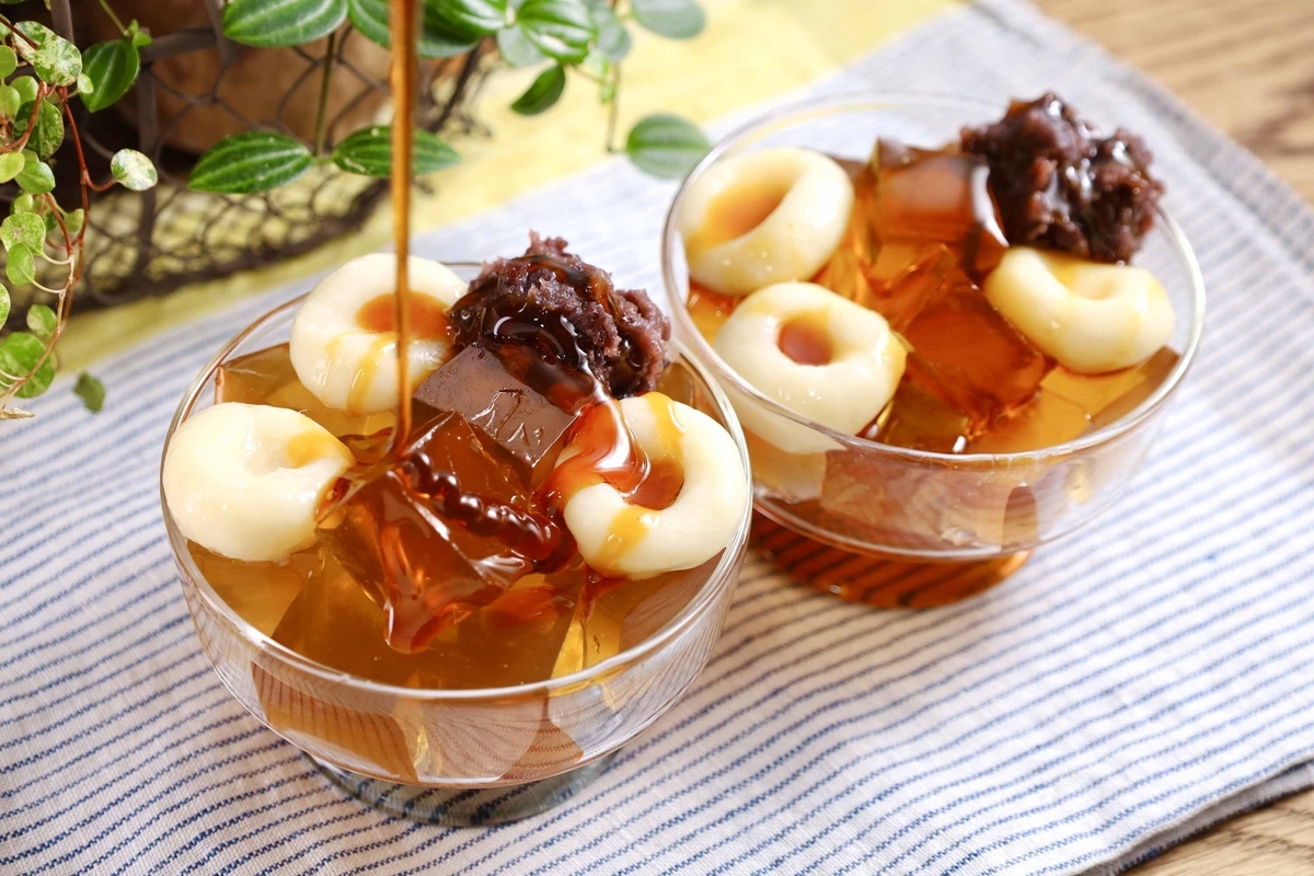 今回は豆腐で練り上げたふわふわ食感の白玉だんご+あんこ+黒蜜をかけて食べました。ベースのゼリーが甘さ控えめなので、どんどん食べれちゃう一品です。