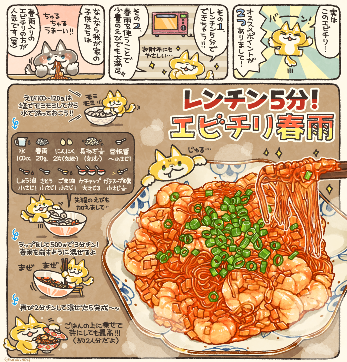 ご紹介する分量で、だいたい2人分かな!大人は小ぶりのどんぶりに、ご飯+エビチリ春雨を乗せて食べました。