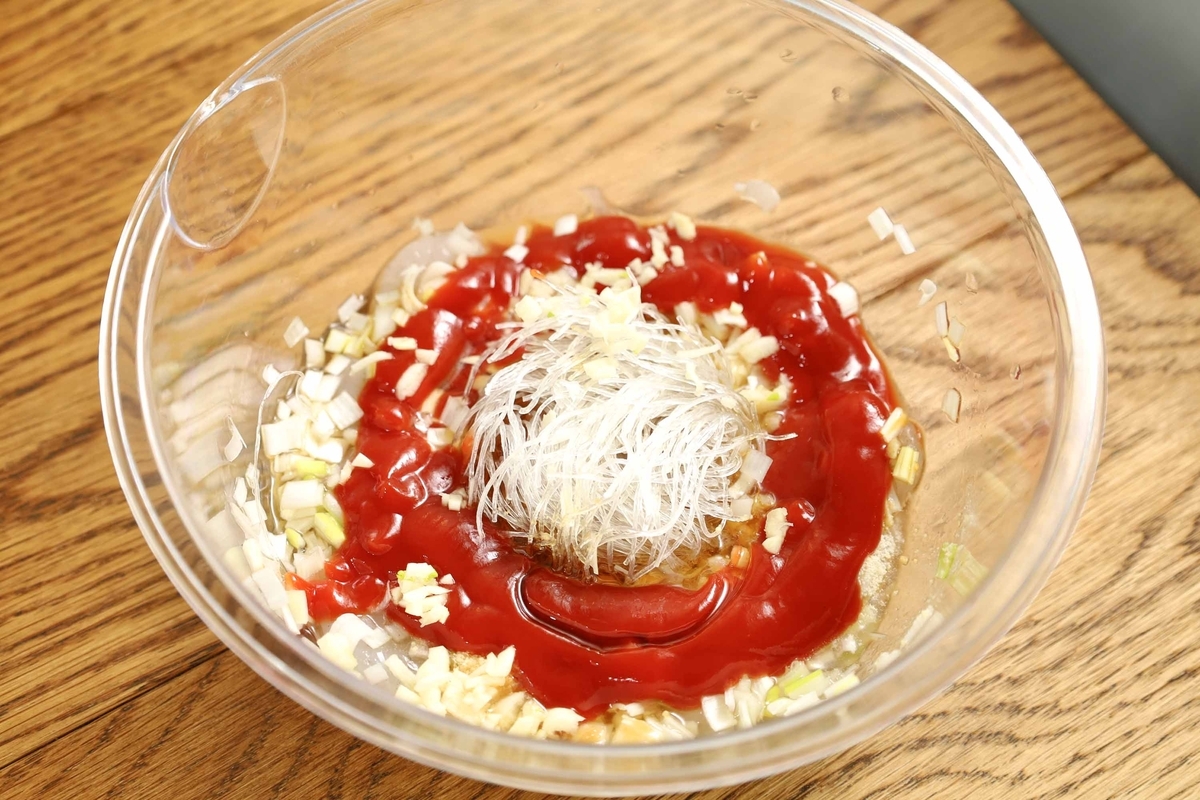軽く混ぜましょう。この時点では春雨はまだカチカチなので、全然混ざりません!できれば春雨全体に水分を絡めるようなイメージで少しほぐすと◎