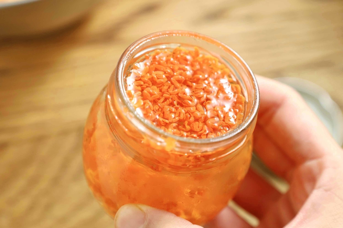 すぐに使いきるならこのままでもいいんだけど、もし長めに保存したいなら、小鍋に瓶を入れ、蓋2cm下くらいまでお湯を張り、15分弱火で加熱しましょう