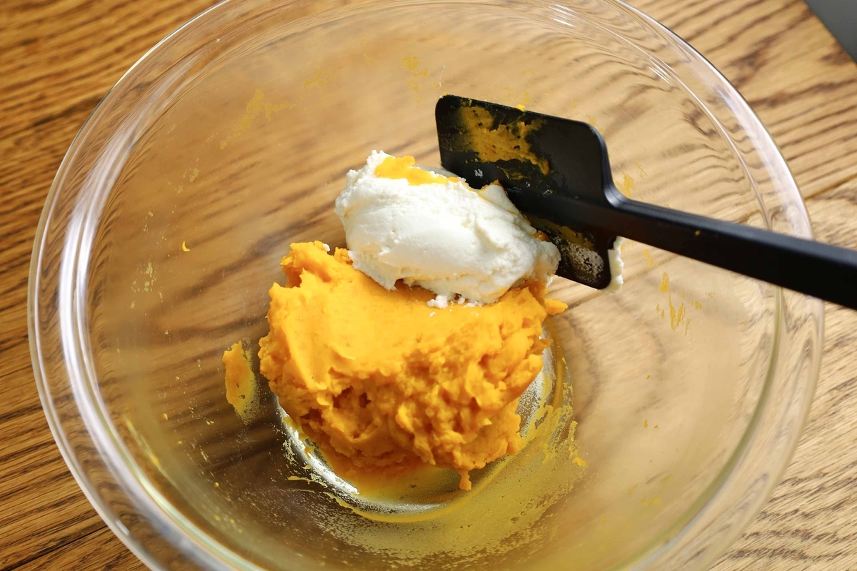 先ほどのかぼちゃのボウルに、豆腐を加えた白玉粉と