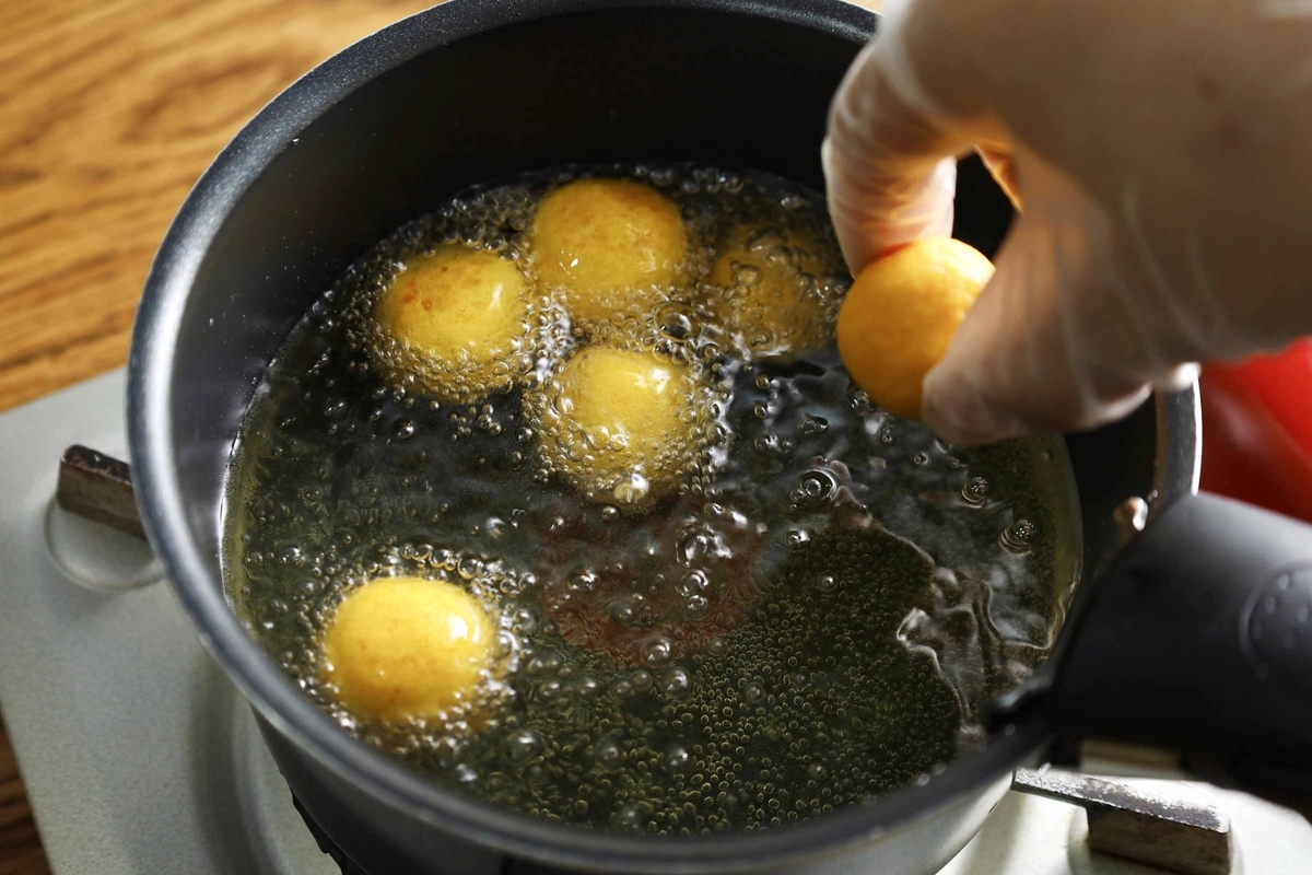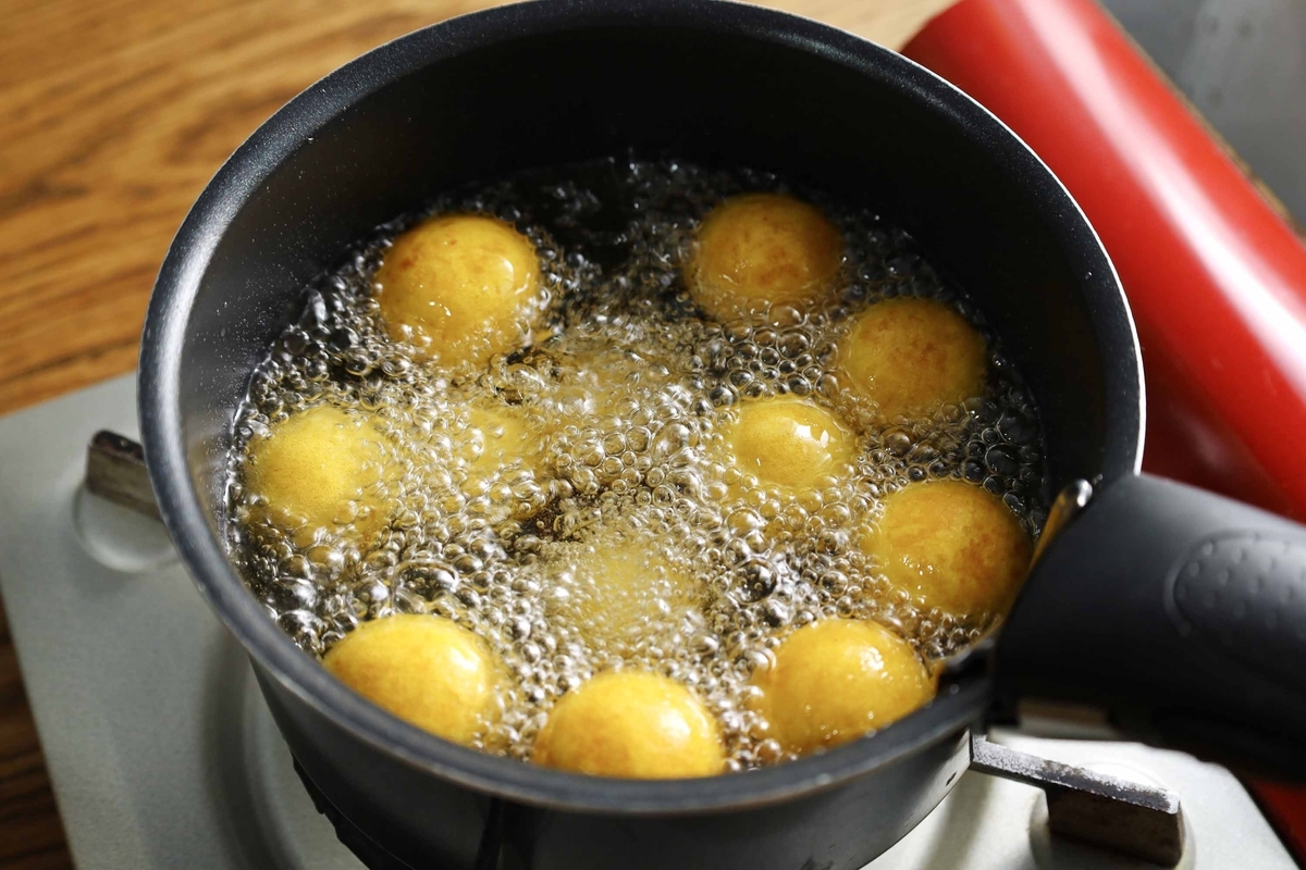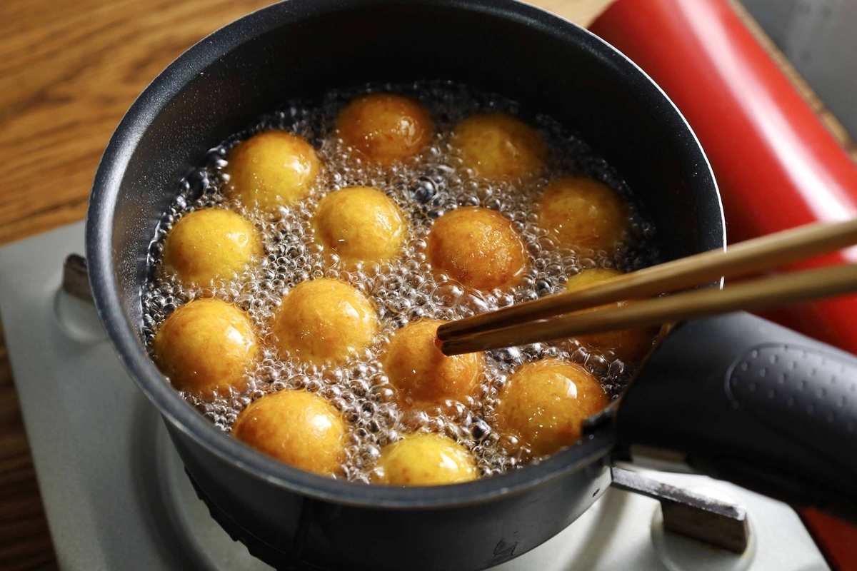 160~170度に温めた油に、丸めた生地を優しく落としたら