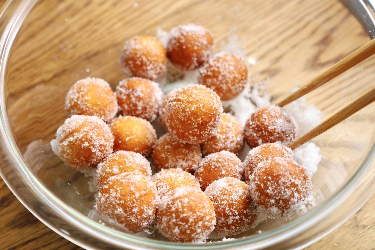 ドーナツがアツアツのうちに砂糖をまぶしましょう