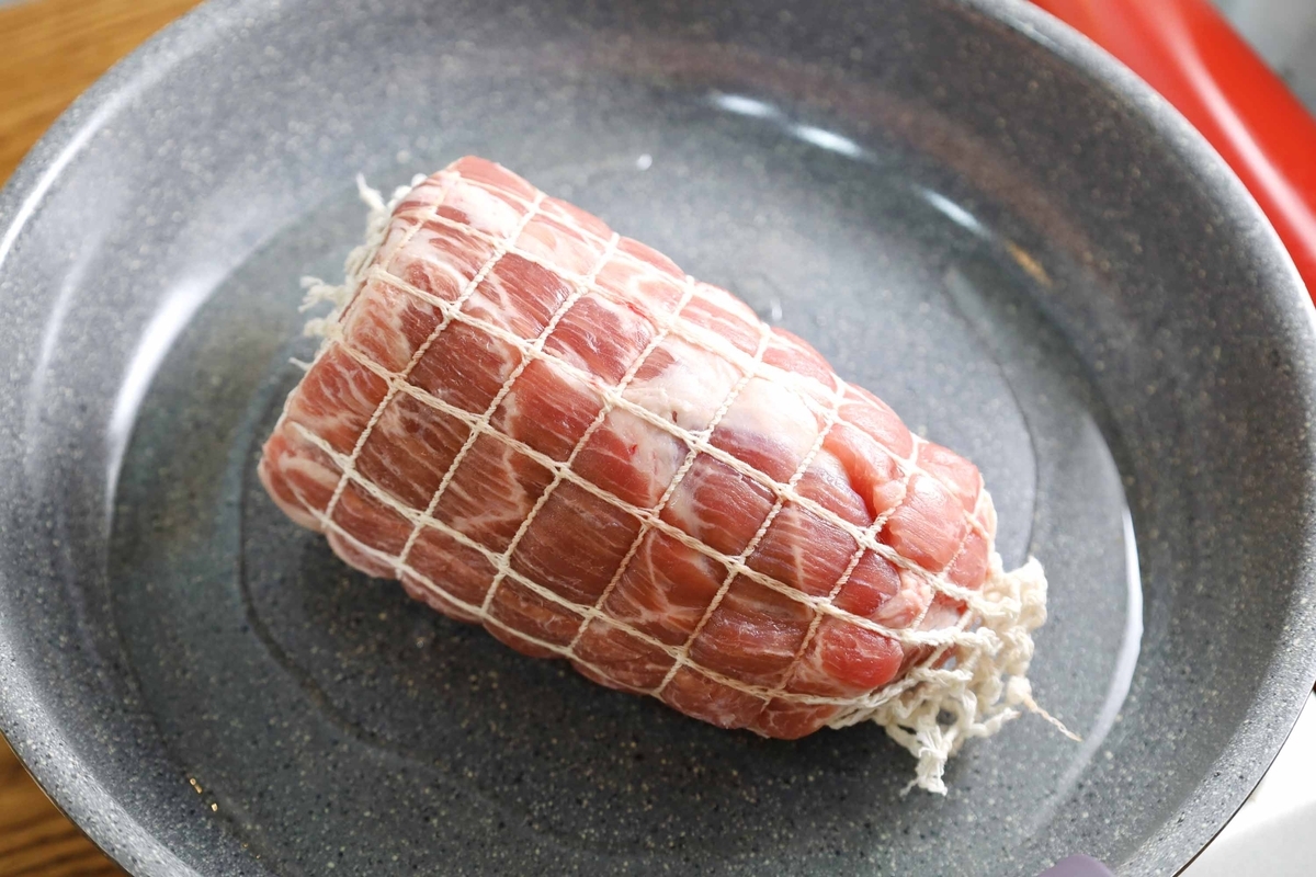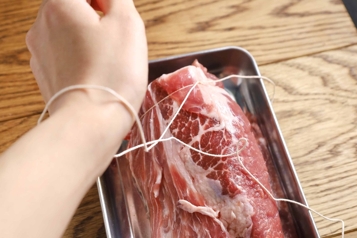 ついていないなら型崩れを防ぐためにタコ糸で縛るのがおすすめ!自分は初めにお肉にたこ糸をかた結びして