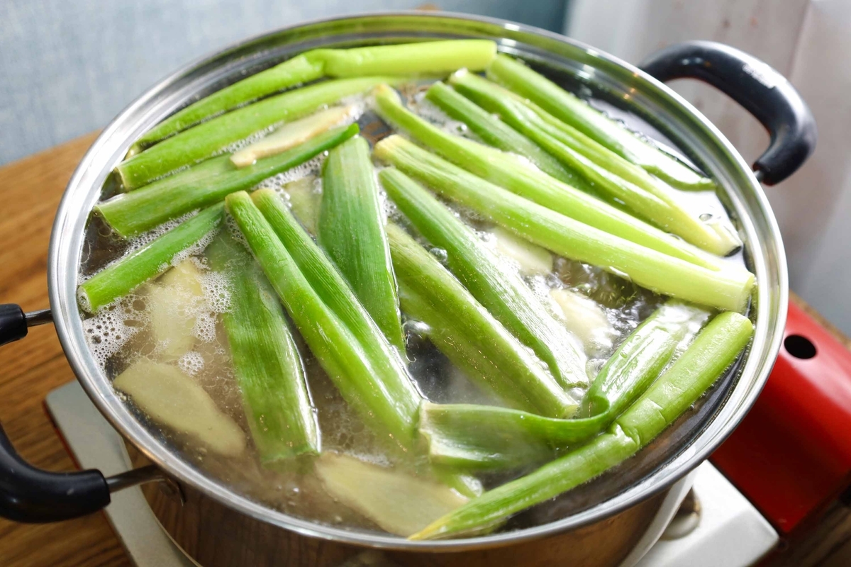 お湯が沸騰してきたら、そこから60分茹でます。
