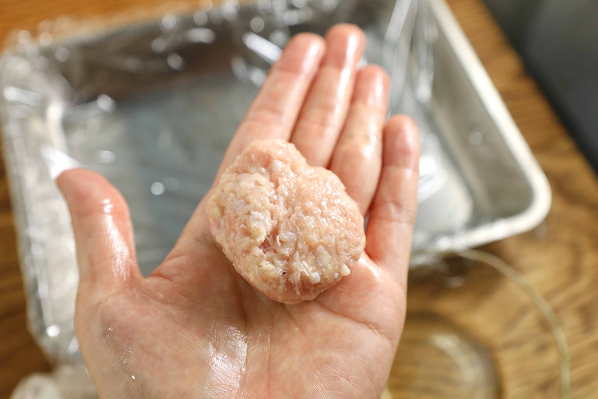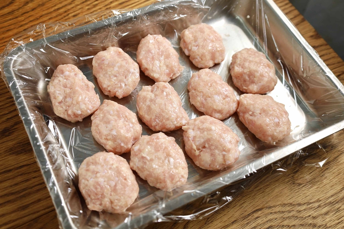 形成したお肉を置くバットにはラップを敷いて下さい。柔らかい肉だねなので、ラップがないとくっついて取れなくなります⚠