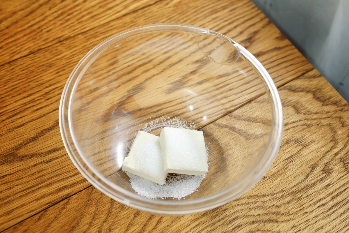 ボウルにA(砂糖30g+クリームチーズ30g)を入れたらよ~く練り混ぜていきます。クリームチーズは常温に戻しておくのがおすすめです。