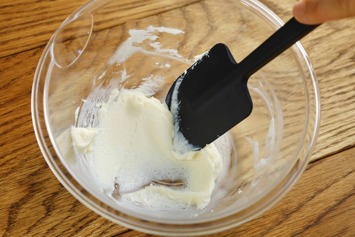 単にクリームチーズを柔らかくするだけではなく、砂糖が溶けて、マヨネーズみたいなテクスチャになるよう混ぜましょう。
