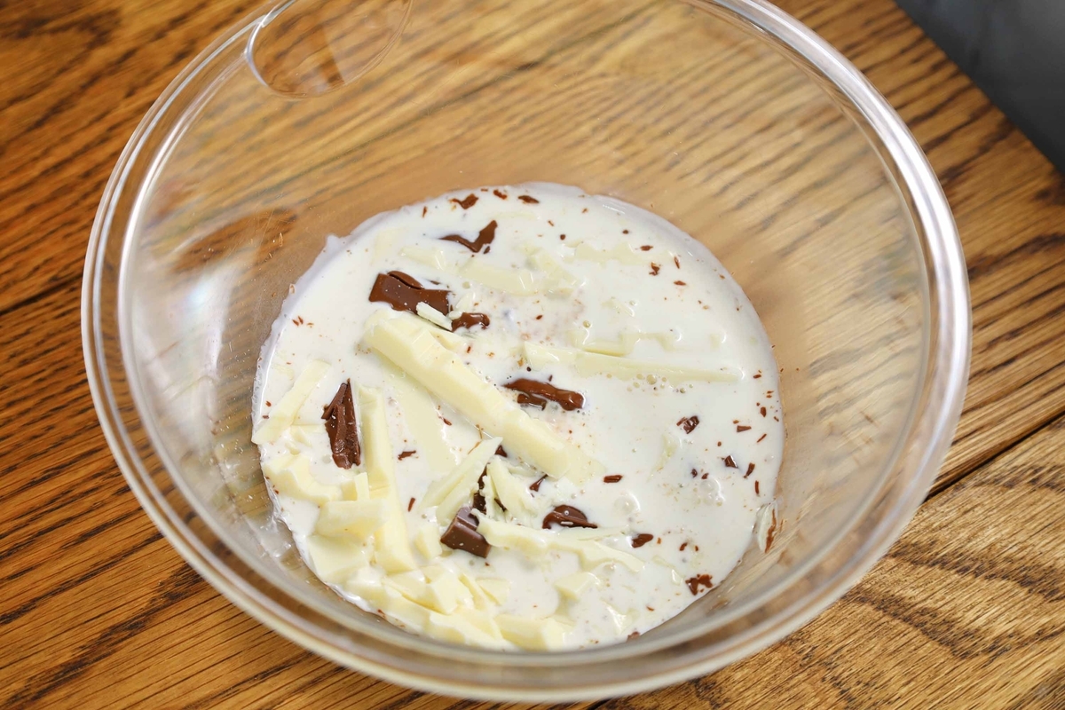 →コーヒー液を抜いて作ることができます!ミルク板チョコ1枚(50g)+ホワイト板チョコ1枚(40g)に、生クリーム35gを加えて溶かす→冷やして下さい。