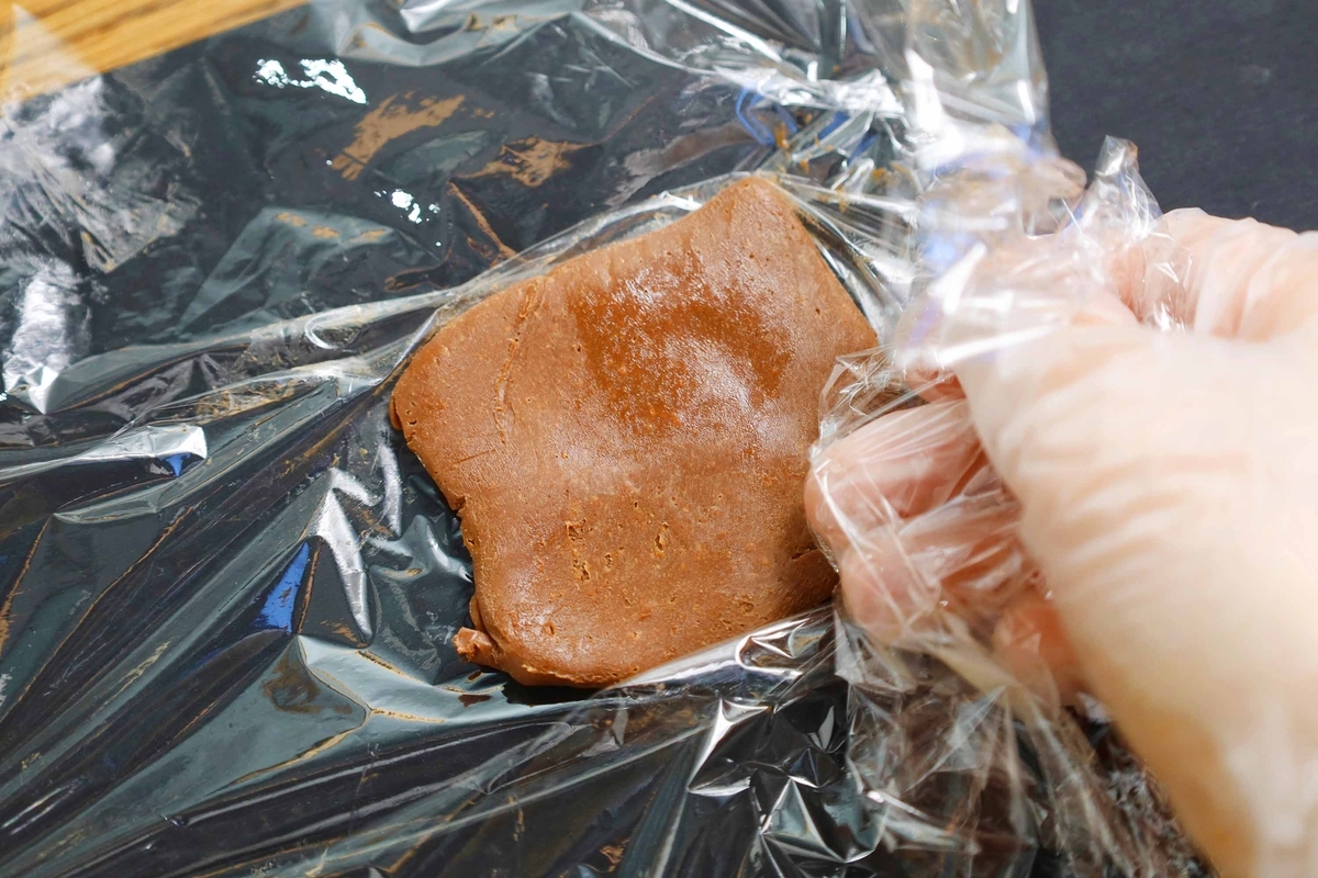 できたコーヒーチョコレートをラップの上に流して、長方形になるよう折りたたんで包んだら、冷凍庫で2時間程冷やし固めます。