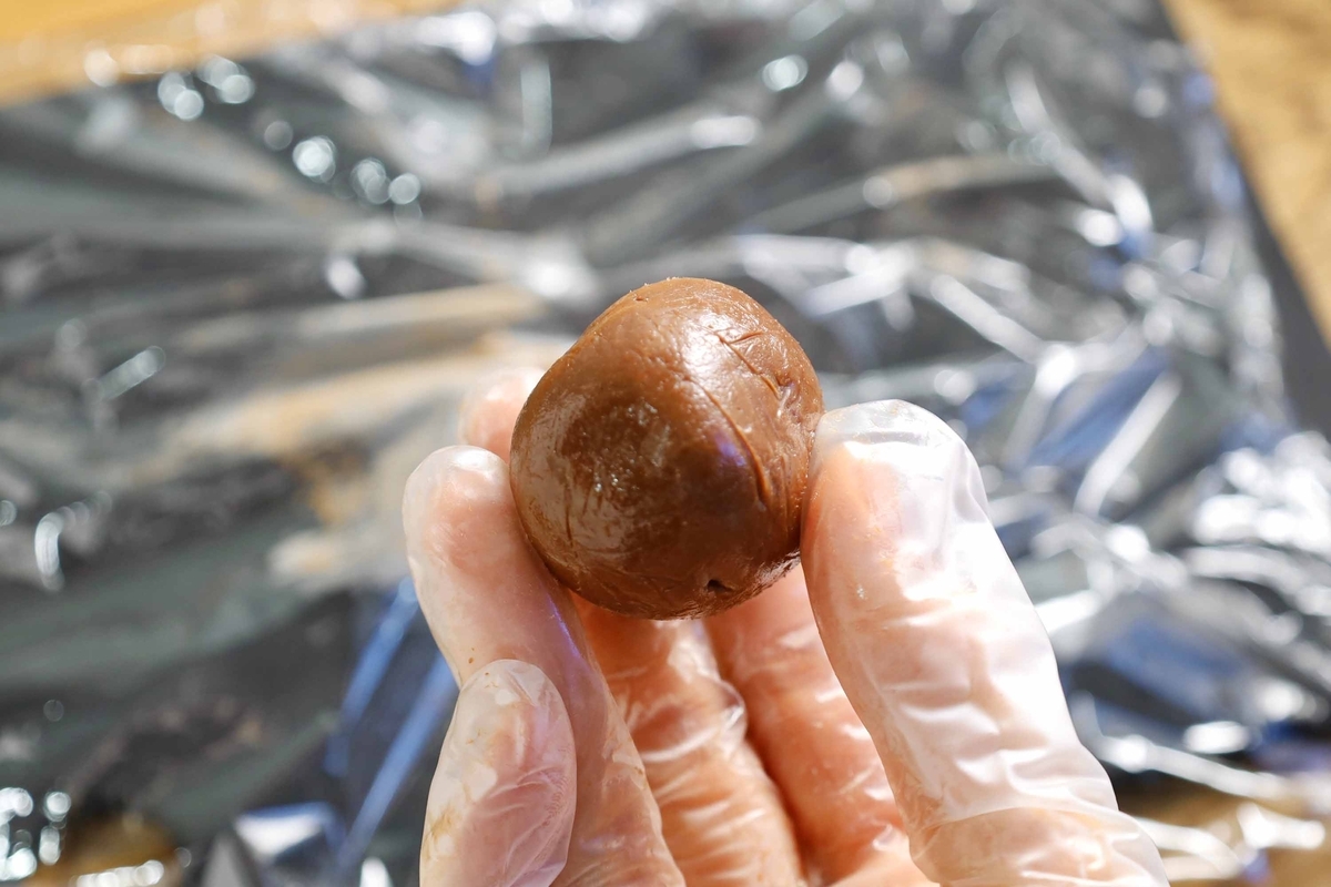 作業中、生チョコもしくはクリームが柔らかくなってきたらすぐに作業を中断し、一度冷凍庫で冷やして下さい。柔らかいとね…いくら頑張ってもうまく包めないからね…