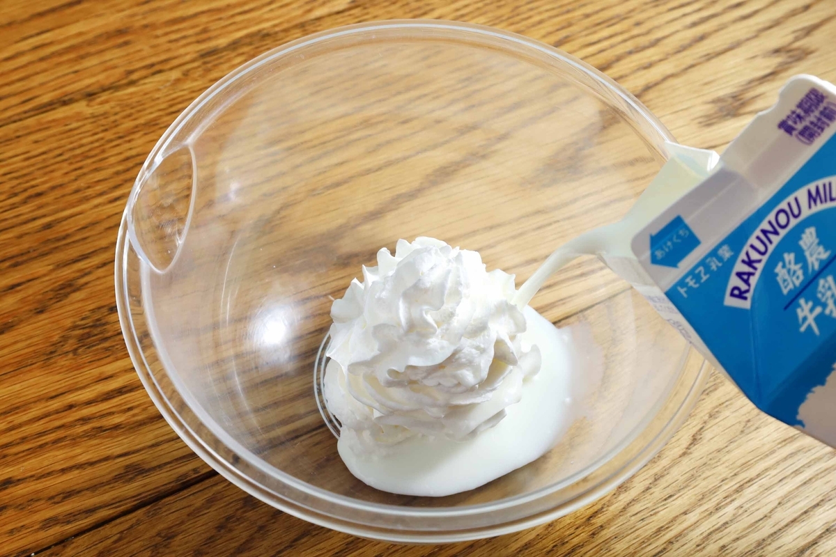 そのまま食べても美味しいけれど、今回はとろとろクリームを添えていこうと思います。市販の泡立て済みクリームを適量小皿に出したら、牛乳を少量加えてまぜまぜ!