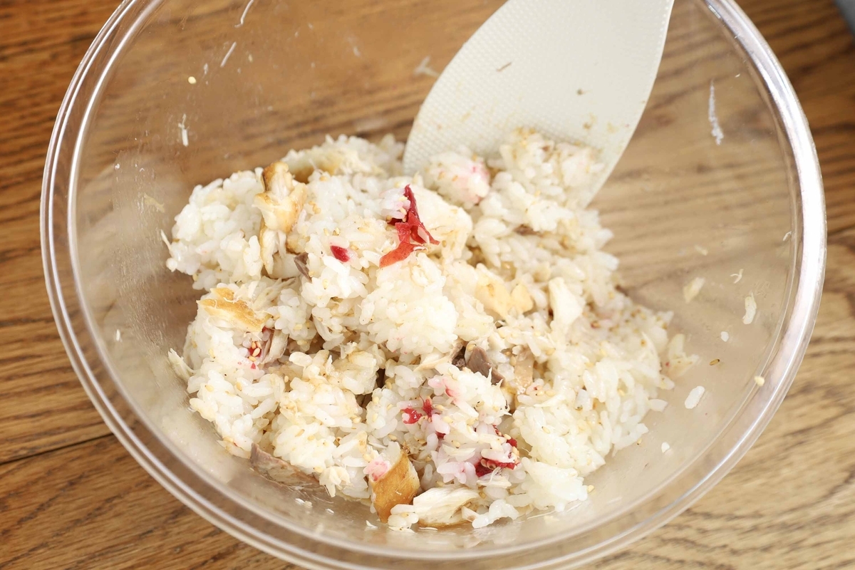 ボウルにA(割烹だしパック1/3+ごはん1合分+白ごま大さじ1+梅干し1個分)とほぐした塩鯖を入れたら