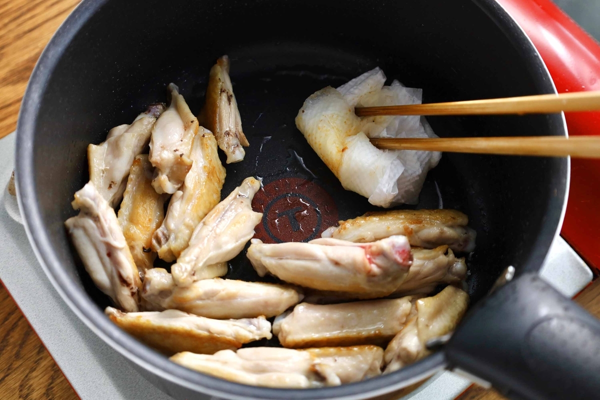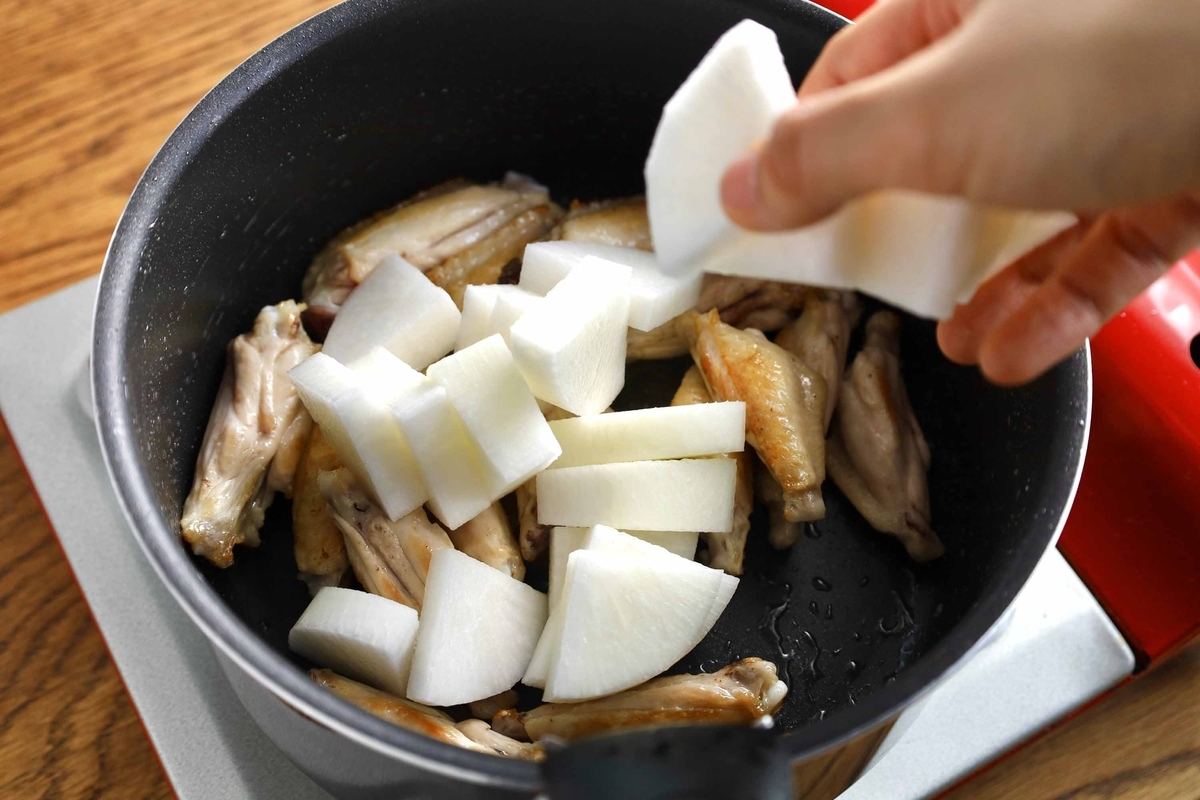 手羽に焼き色がついたら、大根と