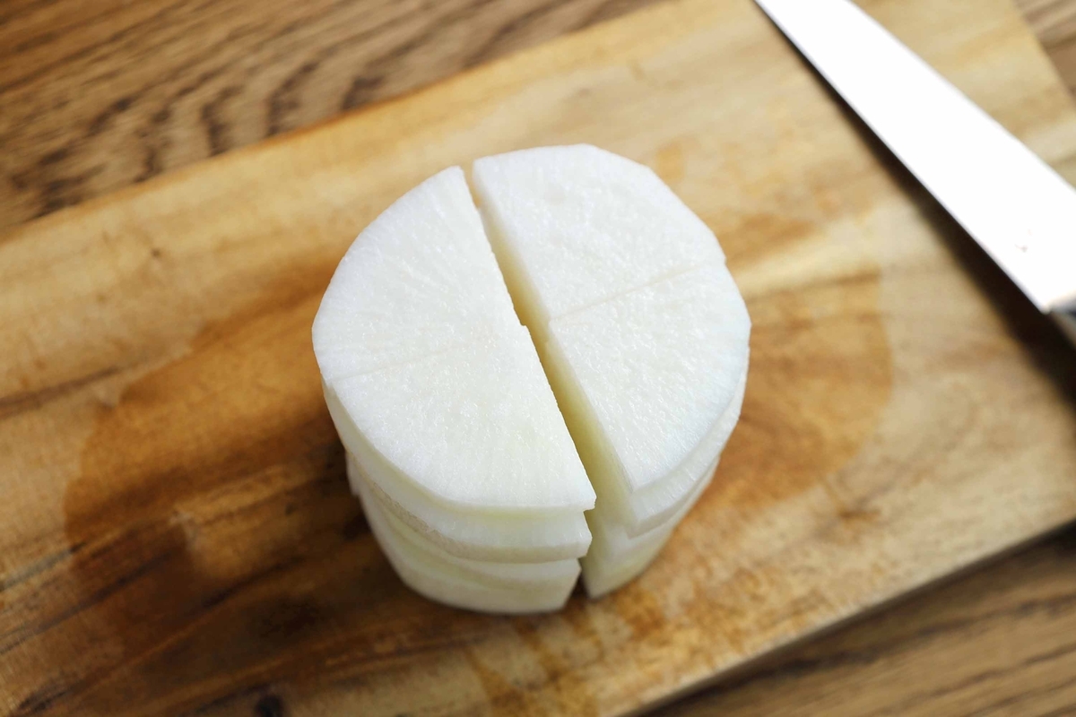 それをさらに4等分しましょう!本当は厚切りの大根が美味しいんだけどね…今回は時短でしっかり味を染み込ませたいのでこの大きさにします