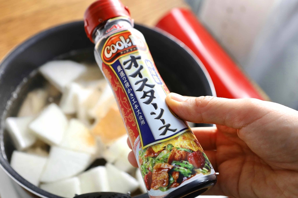 つゆにオイスターソースを加えるのですが、旨味、深みが出るのでまさに必需品!通常の大きいおでんの時も、絶対オイスターソースを入れます✊