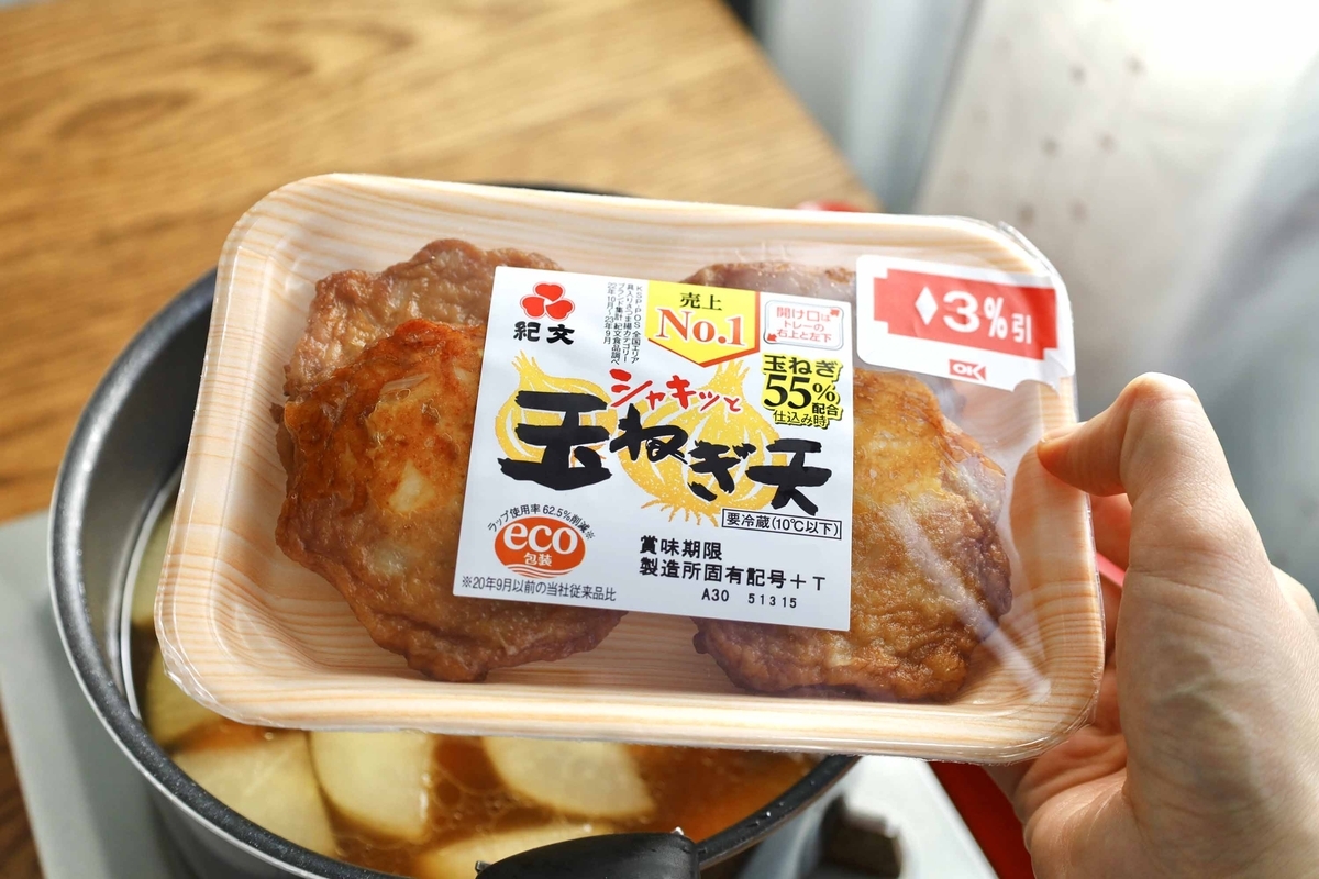 このままでも充分美味しいのですが、おでんと言ったら忘れてはならない「練り物」!お好みの練り物で良いですが「〇〇天」系は本当に良い味が出るのでオススメ。自分は日ごろ、野菜の煮物に入れたりもします。